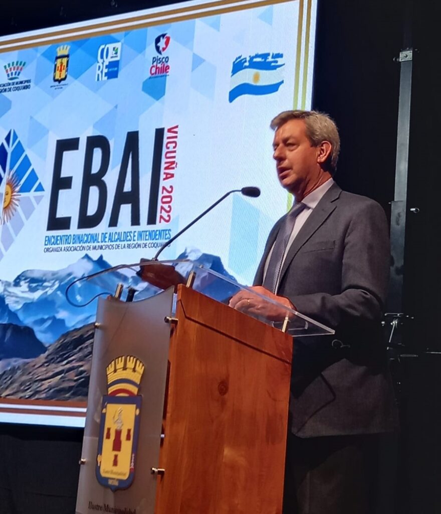 El vicegobernador y presidente nato de la Cámara de Diputados de San Juan, Roberto Gattoni, participó hoy martes 26 de abril, en la hermana República de Chile del “Encuentro Binacional de Alcaldes e Intendentes EBAI Vicuña 2022”, que está cumpliéndose en la comuna de Vicuña, en forma coordinada entre la región de Coquimbo y la provincia de San Juan y organizada por la municipalidad de Vicuña y la Asociación de municipios de la región, donde el tema central es Agua Negra.
