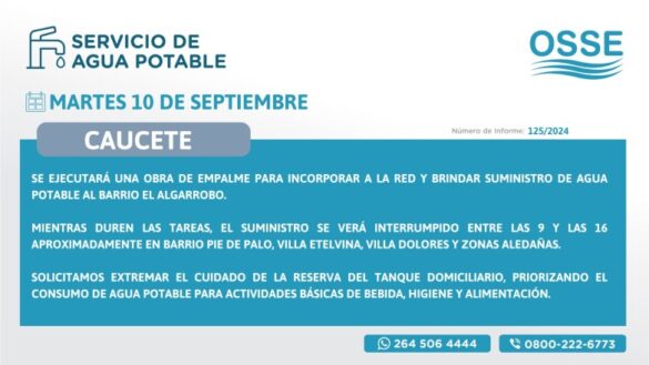 Obras Sanitarias informa que llevará a cabo una obra de empalme para incorporar a la red y brindar suministro de agua potable al barrio El Algarrobo en el departamento Caucete. Mientras avancen las correspondientes maniobras, programadas para este martes 10 de septiembre, el suministro se...