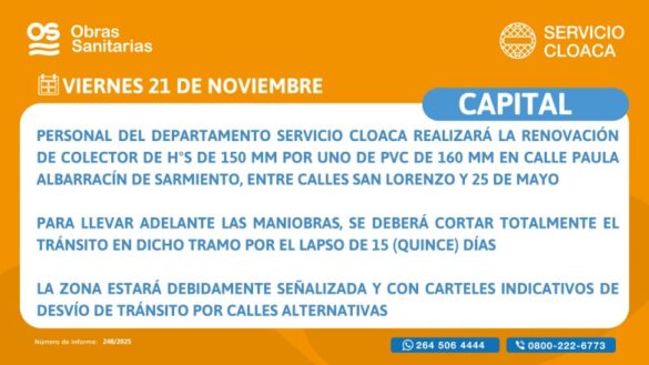 Obras Sanitarias informa que personal del Departamento Servicio de Cloaca de Obras Sanitarias realizará la renovación de cañería colectora de HS 150 mm por uno de PVC de 160 mm. Para llevar adelante estas maniobras, se deberá cortar totalmente el tránsito vehicular en calle Paula...
