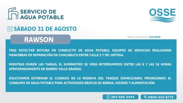 Obras Sanitarias informa que tras haber detectado una rotura de cañería de agua potable de PVC de 450 mm de diámetro, equipos de Servicios iniciarán maniobras de reparación durante la jornada de este sábado 31 de agosto. Mientras duren las tareas se verá afectado el...