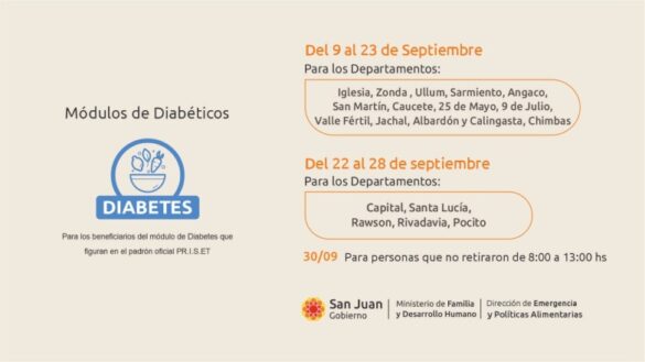 El Ministerio de Familia y Desarrollo Humano, a través de la Dirección de Emergencia y Políticas Alimentarias, informa que el martes 9 de septiembre comienza una nueva etapa de entrega de módulos alimentarios destinados a personas con diagnóstico de diabetes, en toda la provincia. Las...