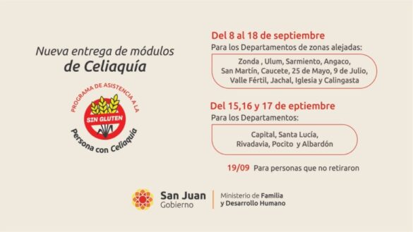 El Ministerio de Familia y Desarrollo Humano informa que durante el mes de septiembre se llevará a cabo la distribución de los módulos alimentarios destinados a personas celíacas. Vale destacar que en los departamentos Chimbas y Rawson, junto con las entregas de los módulos, se...