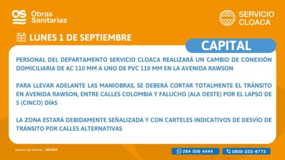 Personal del Departamento Servicio de Cloaca de Obras Sanitarias realizará el cambio de Conexión Domiciliaria de AC 110mm por una nueva de PVC de 110mm. Para llevar adelante estas maniobras, se deberá cortar totalmente el tránsito vehicular en Avenida Rawson entre calles Colombia y Falucho,...