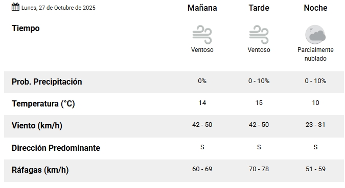 Este lunes 27 de octubre, la ciudad de San Juan amaneció bajo condiciones meteorológicas dominadas por el viento sur, que se mantiene sostenido en los 45 km/h y con ráfagas que podrían alcanzar entre 70 y 78 km/h, según datos del Servicio Meteorológico Nacional. La visibilidad se encuentra reducida a 8 kilómetros por polvo en suspensión, mientras que el cielo se presenta parcialmente nublado.