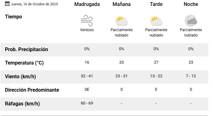 Durante la madrugada, se esperan ráfagas provenientes del sureste que podrían alcanzar entre 60 y 69 km/h, mientras que el viento sostenido oscilará entre 32 y 41 km/h. A medida que avance la mañana, se prevé que las ráfagas disminuyan, con una intensidad moderada del sur (entre 23 y 31 km/h).