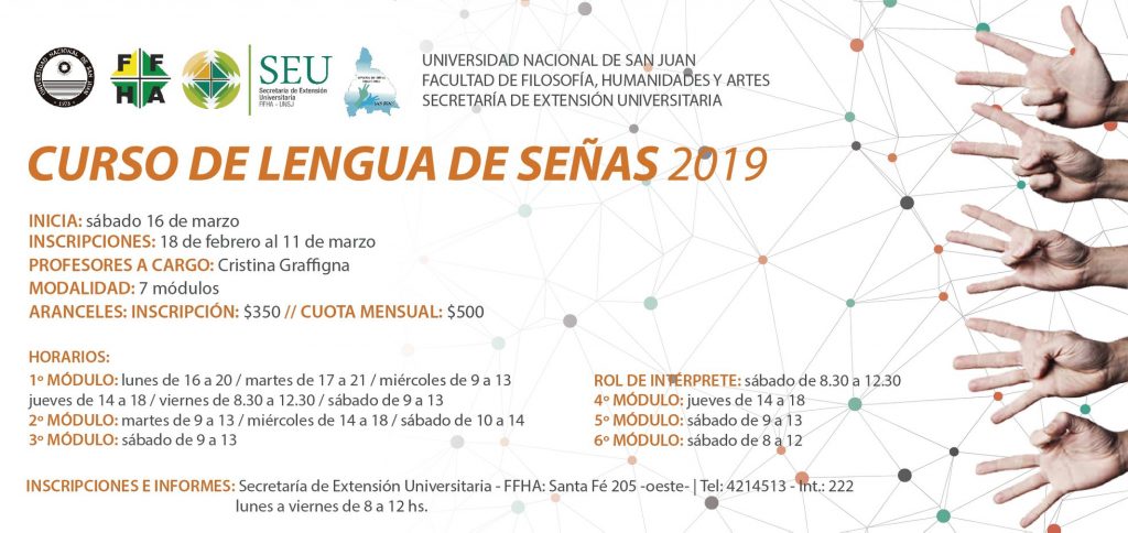 La Secretaría de Extensión Universitaria de la Facultad de Filosofía, Humanidades y Artes informa que están abiertas las inscripciones para el Curso “Lengua de señas 2019” que inicia el cursado el próximo 16 de marzo y estará a cargo de la profesora Cristina Graffigna. Las inscripciones se realizarán del 18 de febrero al 11 de marzo.