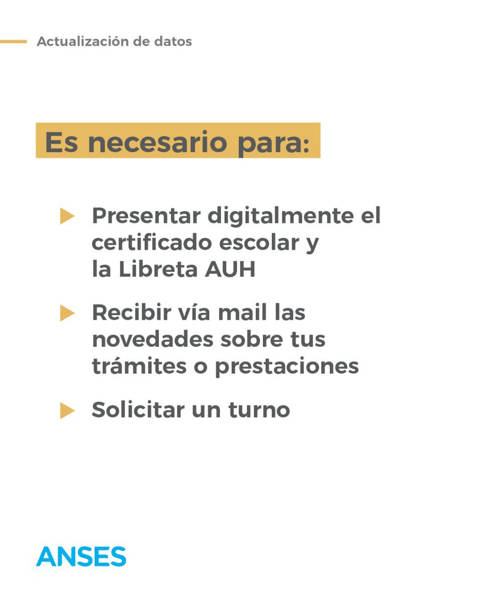 ✅ Mantener actualizados tus datos de contacto (teléfono celular y correo electrónico) en mi ANSES te permite realizar trámites y consultas por internet y recibir notificaciones sobre tu prestación.