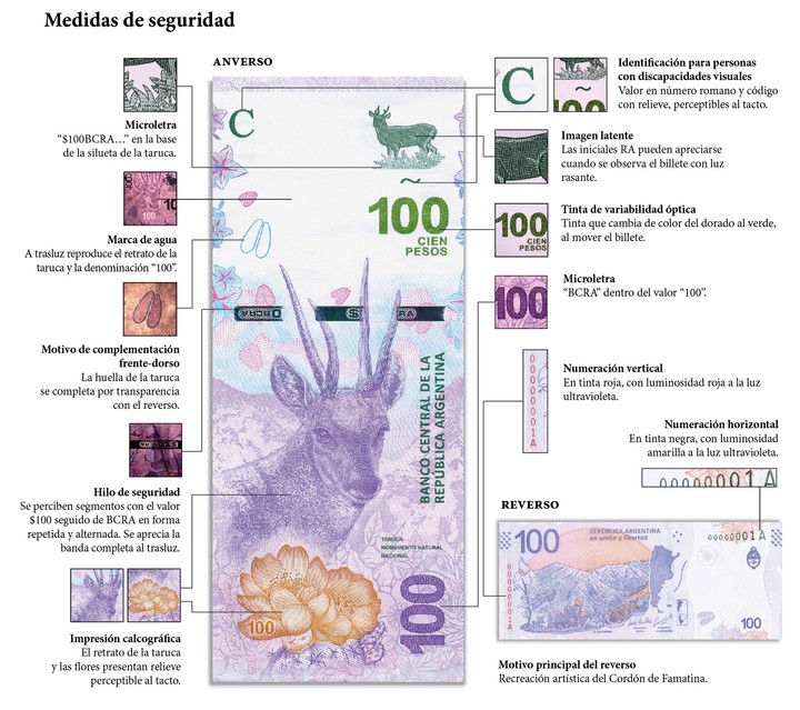 Según la autoridad monetaria, entre las medidas de seguridad del billete se destacan «la marca de agua -que reproduce el retrato de la taruca y, en la parte inferior, la denominación ‘100’ y el hilo de seguridad, una banda incorporada al papel que contiene la leyenda ‘$100’ seguido de ‘BCRA’, en forma repetida y alternada».