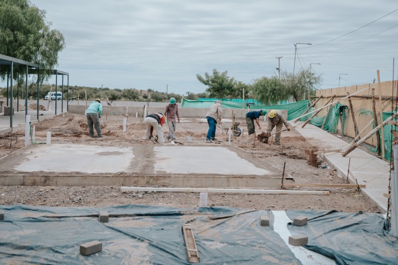 También avanza la contrucción de un escenario, concebido como un espacio destinado a actividades culturales, religiosas y comunitarias. En este sector se ejecutan trabajos estructurales vinculados a plateas y armado de estructuras, que permitirán acompañar celebraciones y eventos de gran convocatoria.