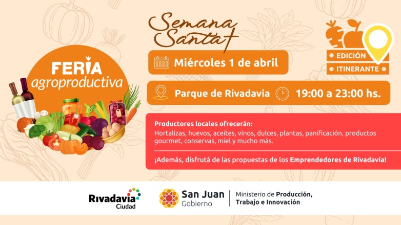 Este miércoles 1 de abril, el Parque de Rivadavia vuelve a ser el punto de encuentro de la Feria Agroproductiva, que reunirá a productores y emprendedores sanjuaninos de 19 a 23 hs. La propuesta incluye una amplia variedad de productos regionales, venta directa al público y la amplia propuesta de los emprendedores de Rivadavia, que también realizarán juegos con premios.