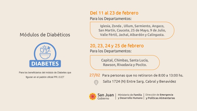 En el Gran San Juan, la distribución de los módulos alimentarios para personas con diabetes de los departamentos Capital, Chimbas, Santa Lucia, Rivadavia y Rawson, además de Pocito se hará los días 20, 23, 24, 25/02 de 8 a 13 horas, en el depósito del Ministerio de Familia y Desarrollo Humano, ubicado en calle Salta 1724 (norte), entre Sargento Cabral y Benavídez.