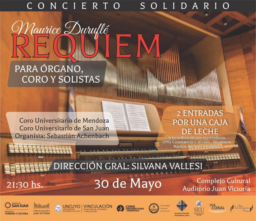 Organizado a través del Centro de Creación Artística Coral de la Facultad de Filosofía, Humanidades y Artes de la UNSJ en forma conjunta con el Auditorio Juan Victoria, y bajo la dirección de la Maestra Silvana Vallesi, recientemente distinguida por la Fundación KONEX con diploma de mérito por su labor como Directora de Coro siendo una de las personalidades destacadas de la última década de la Música Clásica en la Argentina, el Coro Universitario de Mendoza y el Coro Universitario de San Juan que dirige el Prof. Jorge Romero, se presentarán el día 30 de mayo a las 21:30 hs para interpretar el REQUIEM Op.9 de Maurice Duruflé en su versión para órgano, coro y solistas. La obra más famosa de Duruflé llega a San Juan con la actuación de reconocidos solistas de Argentina: Sebastián Achenbach (órgano), Gloria López (mezzosoprano) y Fernando Lázari (barítono). El Coro Universitario de Mendoza, primer y única formación coral de toda Latinoamérica en obtener el Gran Premio Europeo de Canto Coral, máxima competencia mundial del rubro, ofrecerá en la primera parte del concierto una selección de obras de su repertorio. El evento tiene carácter de solidario bajo la modalidad de canje: dos entradas a cambio de una caja de leche en polvo de 800 gr., que serán destinadas a los merenderos de la ONG “Constancia y Acción” en Rivadavia y “Rayito de Sol” en Chimbas. El canje se realizará los días 29 y 30 de mayo desde las 09:00 hs hasta las 12:30 hs, en el Centro de Creación Artística Coral (Escuela de Música) ubicado en calle Félix Aguilar 387 Norte, Capital, y dos horas antes el día del evento en el Auditorio Juan Victoria.
