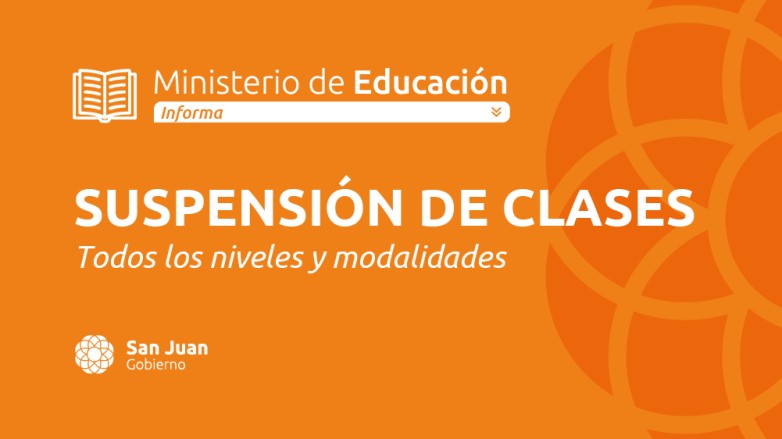 Ante el alerta meteorológica por vientos fuertes emitida por el Servicio Meteorológico Nacional y por recomendación de Protección Civil de la provincia; el Ministerio de Educación informa que se suspende la actividad escolar de este viernes 26 de septiembre en los departamentos Jáchal, Iglesia y Calingasta en los turnos tarde, vespertino y noche. Por su parte, la suspensión alcanzará al resto de la provincia pero en los turnos vespertino y nocturno, en todos los niveles y modalidades.