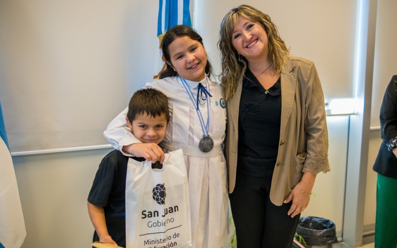 Ingrid Rottis, estudiante de sexto grado de la escuela Nuevo Cuyo, de Rivadavia, recibió una medalla y una mención especial tras su participación en el taller “Desafíos Educativos” de la Feria Nacional de Educación, Artes, Ciencias y Tecnología, organizada por el Ministerio de Capital Humano, a través de la Secretaría de Educación. La alumna fue recibida por la ministra de Educación, Silvia Fuentes, quien la felicitó por el logro.